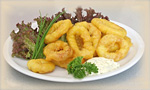 Sardinen Kalamaris mit hausgemachter Creme,Pommes frites und gemischtem Salat |