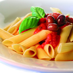 Makkaroni mit Hähnchen und Champignons, in Tomatensahnesauce |