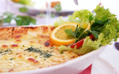 M9) Kartoffel-Blumenkohl-Auflauf Vorderschinken, Makkaroni, Tomaten-Sahnesauce, mit Käse überbacken 7,40 €